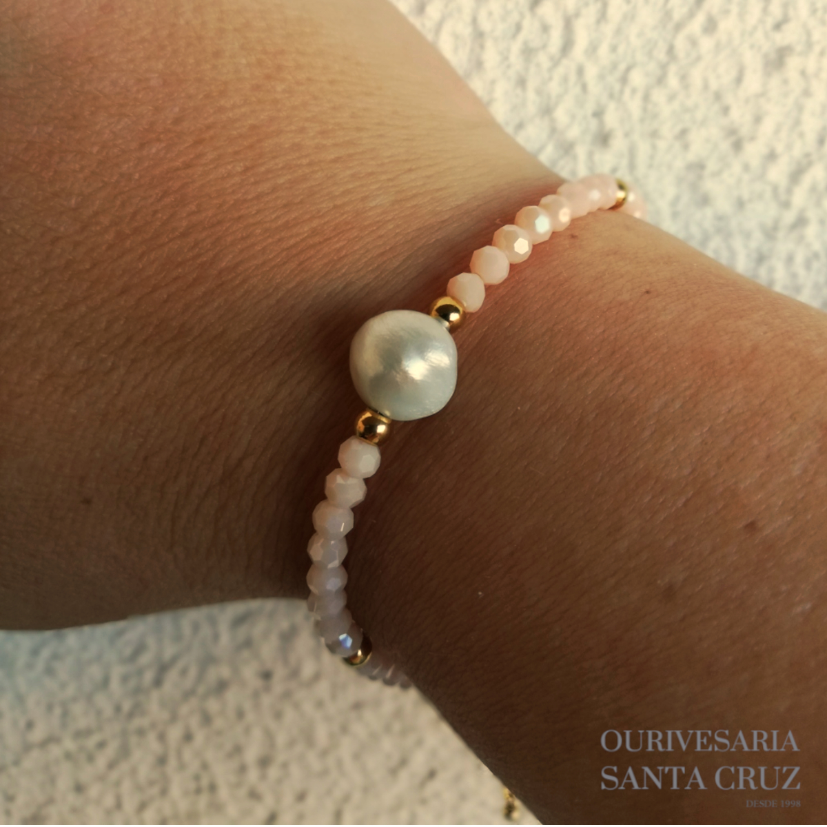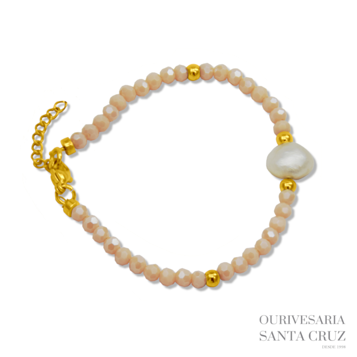 Da nova coleção Santa Cruz Joias, a pulseira Ocean em aço banhado a ouro e com cristais rosa.